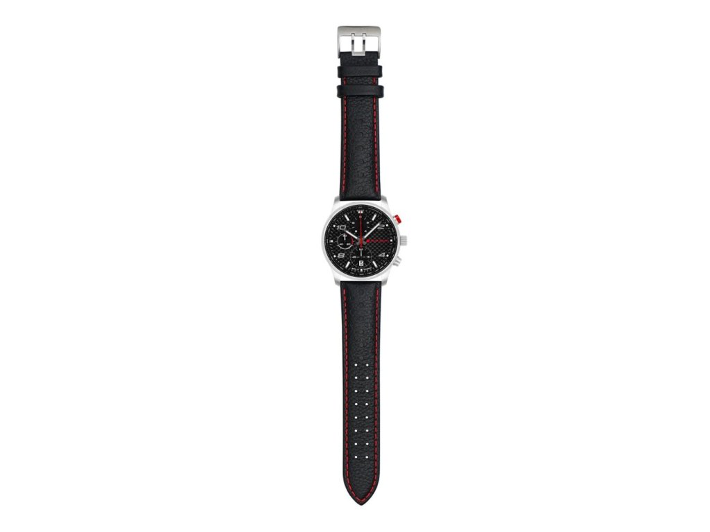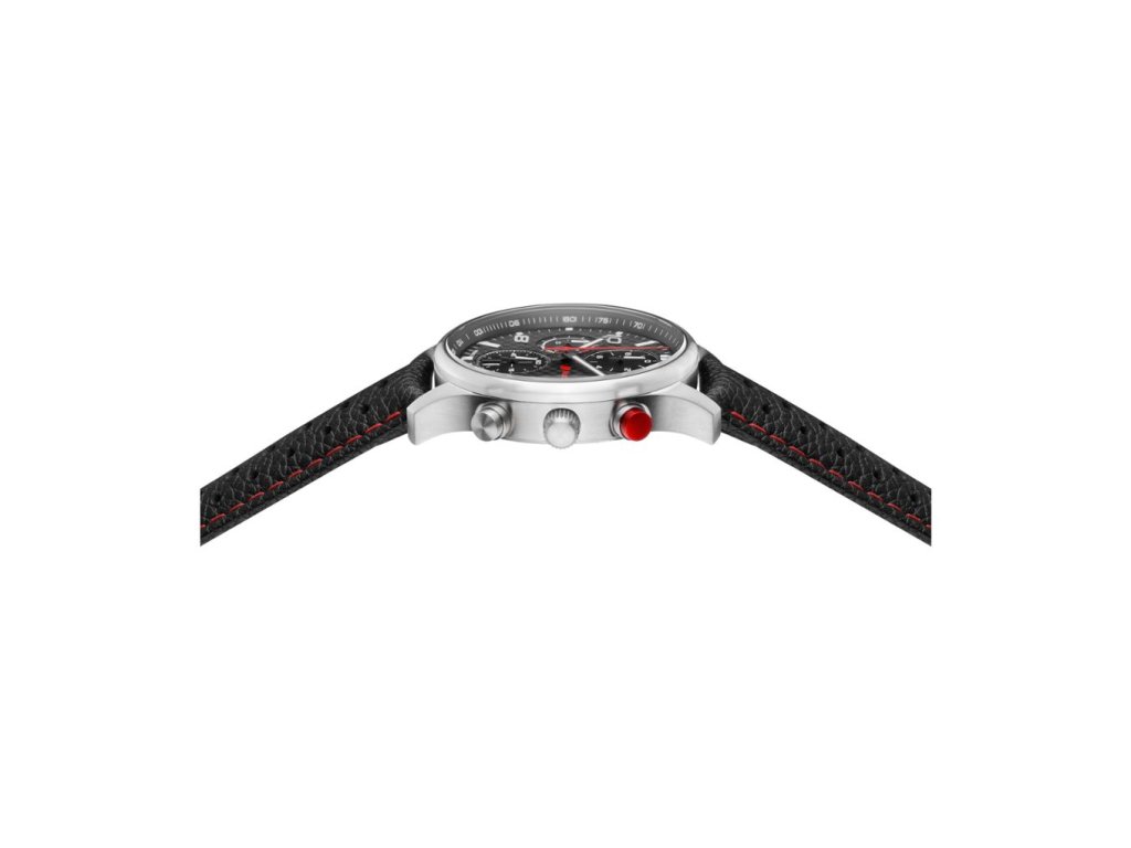 - satinované pouzdro z nerezové oceli 316 L s červeným tlačítkem chronografu a šroubovací zadní stranou pouzdra