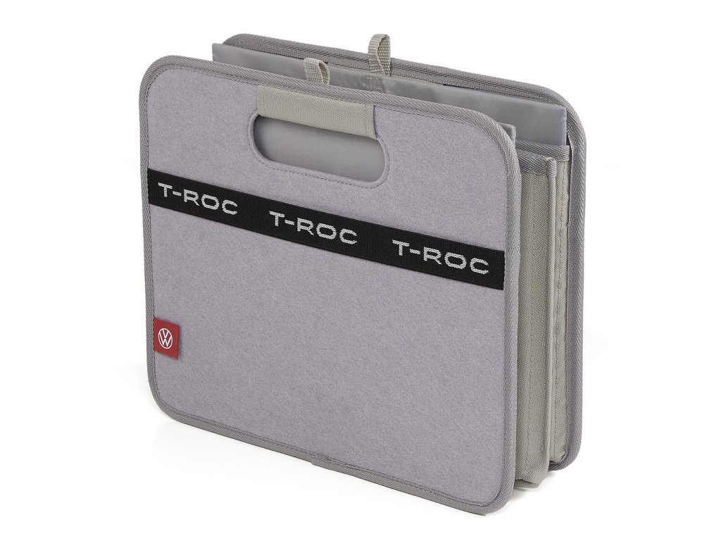 Jen několika pohyby lze udělat z ploché tašky velký, pevný box - a naopak. Snadná manipulace i údržba. Červený štítek s logem VW a nápisem T-ROC.